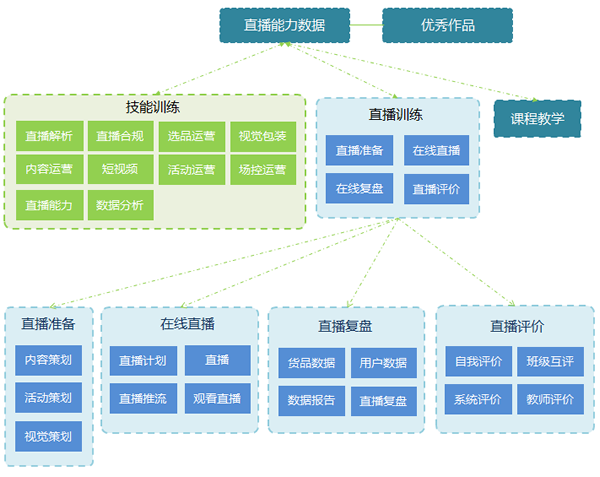 最后系統(tǒng)將根據(jù)學(xué)生的技能訓(xùn)練、直播訓(xùn)練和課程教學(xué)各版塊的技能練習(xí)情況,綜合分析學(xué)生的直播能力,形成直播能力數(shù)據(jù),幫助學(xué)生改進(jìn)和提升直播營(yíng)銷運(yùn)營(yíng)能力。