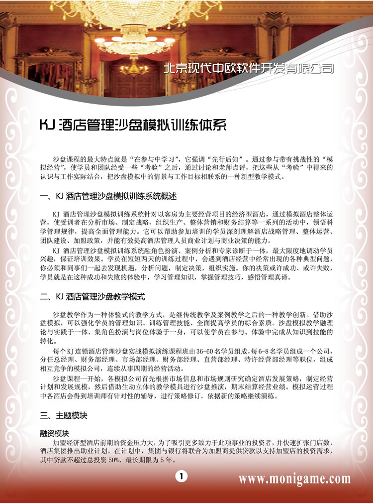 它可以幫助參加培訓(xùn)的學(xué)員深刻理解酒店戰(zhàn)略管理、整體運(yùn)營(yíng)、團(tuán)隊(duì)建設(shè)、加盟政策,并能有效提高酒店管理人員商業(yè)計(jì)劃與商業(yè)決策的能力。